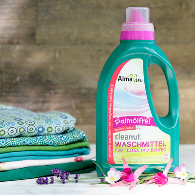 Beim AlmaWin Cleanut wird alle Reinigungskraft aus dem Saponin gewonnen. Dabei wird auf die palmkernölbasierten Waschsubstanzen vollständig verzichtet. So wird Palmöplantagenbau in den tropischen Wäldern nicht unterstützt.