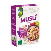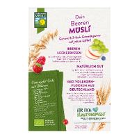 HAFERvollkornflocken* 41%, GERSTENvollkornflocken* 26%, Sultaninen*, DINKELvollkornflocken*¹ 6%, DINKELflakes*¹ 4% (DINKEL*¹), Weinbeeren*, Apfelwürfel*, gefriergetrocknete Beeren * 2,6% (in veränderlichen Gewichtsanteilen Himbeeren*, Heidelbeeren* , Erdbeeren*, rote Johannisbeeren*) , Sonnenblumenöl*.| Energie | Fett | gesättigte Fettsäuren | Kohlenhydrate | Zucker | Ballaststoffe | Eiweiss | Salz |