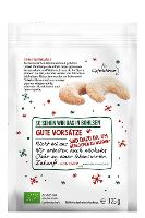 DINKELvollkornmehl*¹ 54%, Puderzucker*(Rübenzucker*), BUTTER* 19%, HASELNÜSSE* geröstet und gemahlen 7%, Sonnenblumenöl*, Weinsteinbackpulver (Säuerungsmittel: Monokaliumtartrat, Backtriebmittel: Natriumhydrogencarbonat, Maisstärke*), Meersalz, Vanille* 0,2%. ¹Dinkel ist eine UrWEIZENart| Energie | Fett | gesättigte Fettsäuren | Kohlenhydrate | Zucker | Ballaststoffe | Eiweiss | Salz |