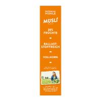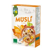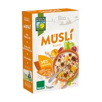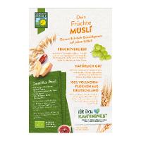 HAFERvollkornflocken* 47 %, Sultaninen*, GERSTENvollkornflocken* 10 %, DINKELvollkornflocken*¹ 8 %, Datteln*, Cornflakes* 3% (Mais*, Trennmittel: Sonnenblumen-Lecithine*), Feigen*, Leinsamen*, Aprikosen*, Apfelwürfel*, Apfelmehl*, Himbeeren* gefriergetrocknet, Reismehl*, Sonnenblumenöl*.| Energie | Fett | gesättigte Fettsäuren | Kohlenhydrate | Zucker | Ballaststoffe | Eiweiss | Salz |