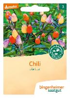 Dekorative, sehr kleinfrüchtige, reich fruchtende Chili mit violetten Blättern. Die sehr scharfen Früchte reifen von Violett über Gelb und Orange auf Rot ab. Besonders geeignet als