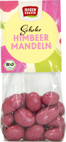 Weiße Schokolade* 44% (Rohrohrzucker*, Kakaobutter*, VOLLMILCHPULVER*), Vollmilchschokolade* 31% (Rohrohrzucker* , Kakaobutter*, VOLLMILCHPULVER*, Kakaomasse*), MANDELN* geröstet 20%, Himbeeren* gefriergetrocknet 2%, Kakaobutter*, Rohrohrzucker*, Überzugsmittel: Gummi arabicum* Kakao: 40% mindestens in der Vollmilchschokolade| Energie | Fett | gesättigte Fettsäuren | Kohlenhydrate | Zucker | Ballaststoffe | Eiweiss | Salz |
